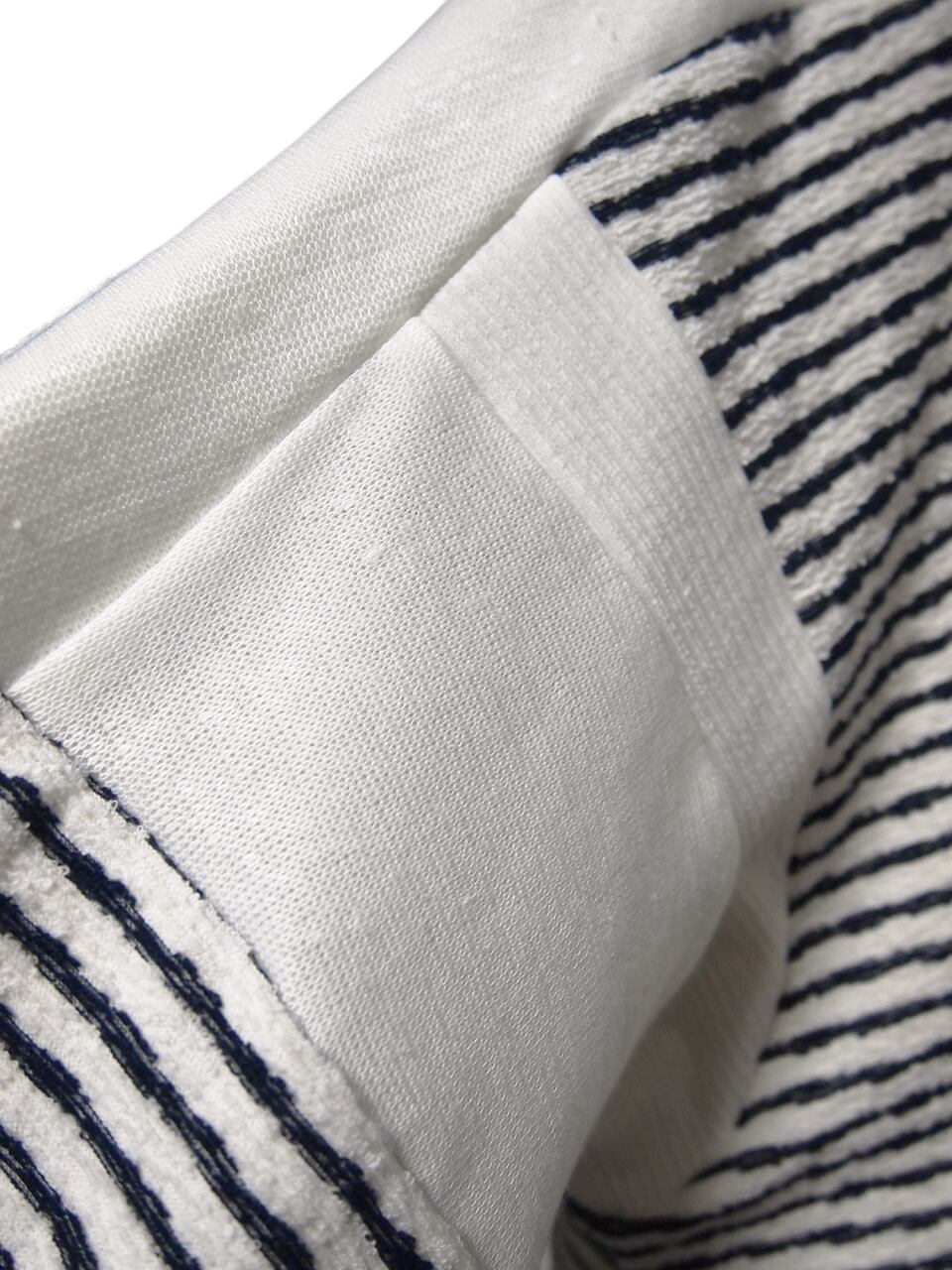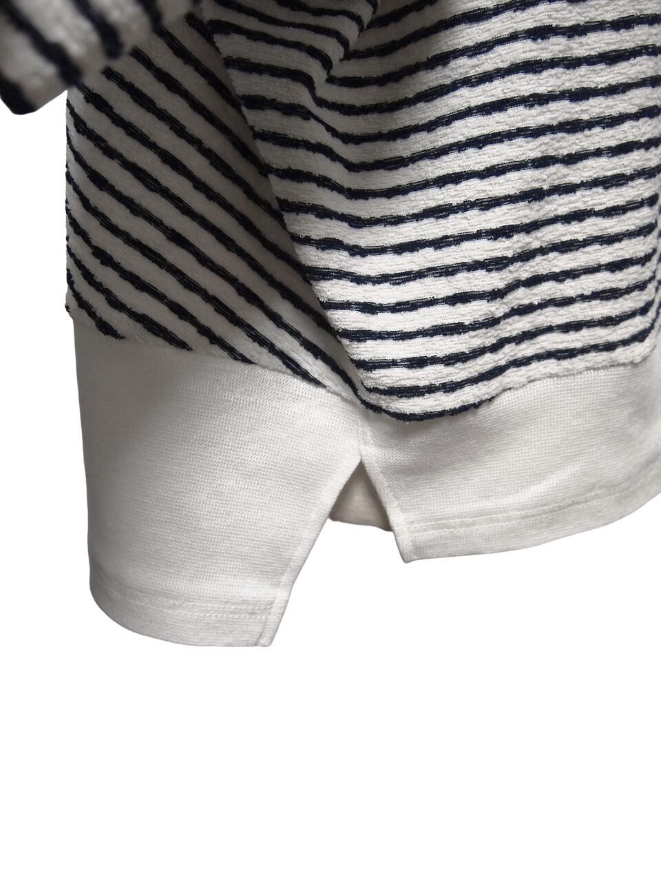 ボーダーとオフホワイト生地の組み合わせの長袖トップスです。 ゆったりしたオーバーサイズです。 デザイン性のあるトップスに仕上がっています。 袖とネック肩のラインは二重になっています。 異なるテクスチャーのコットン生地を4種類使用しています。